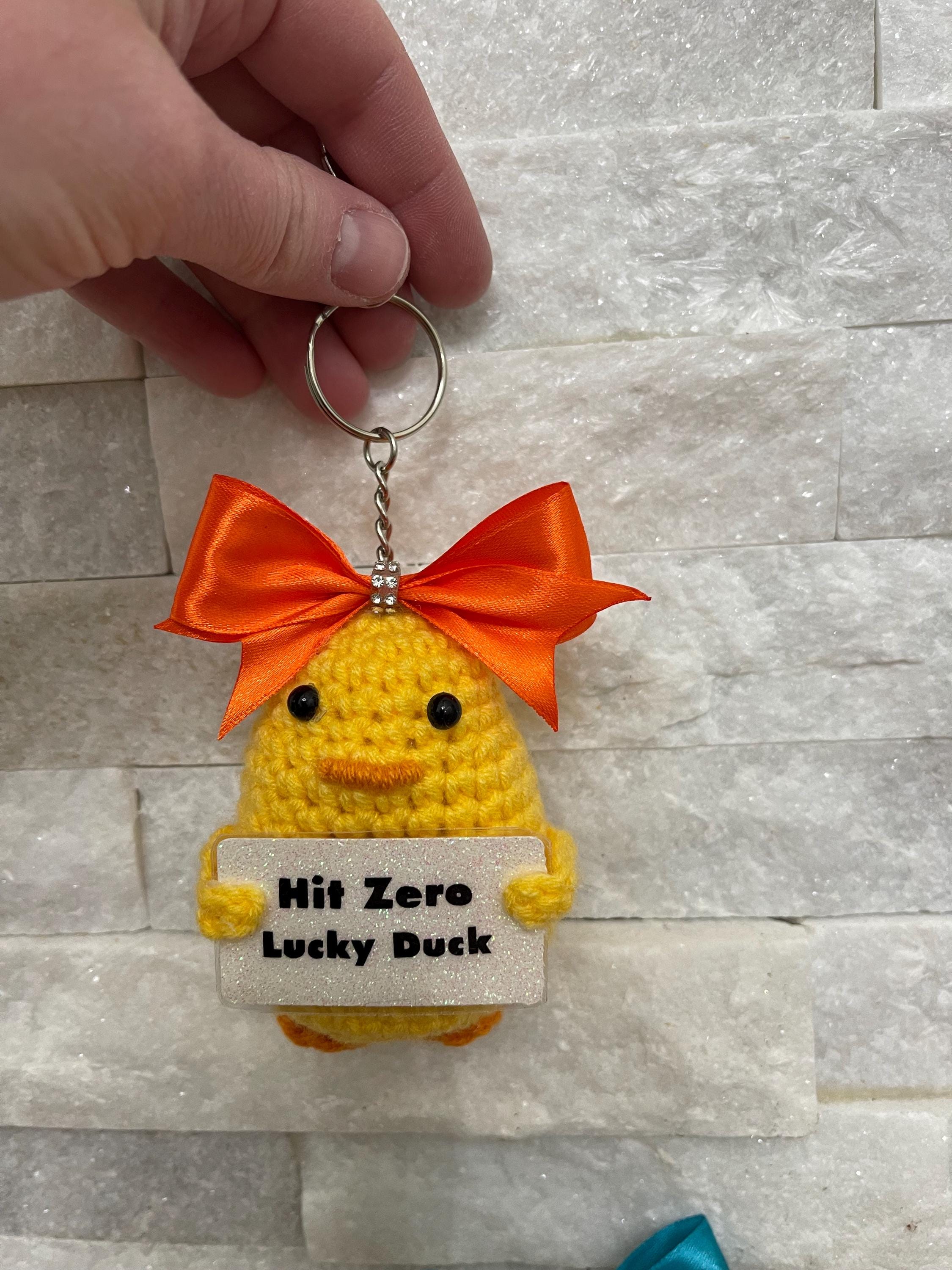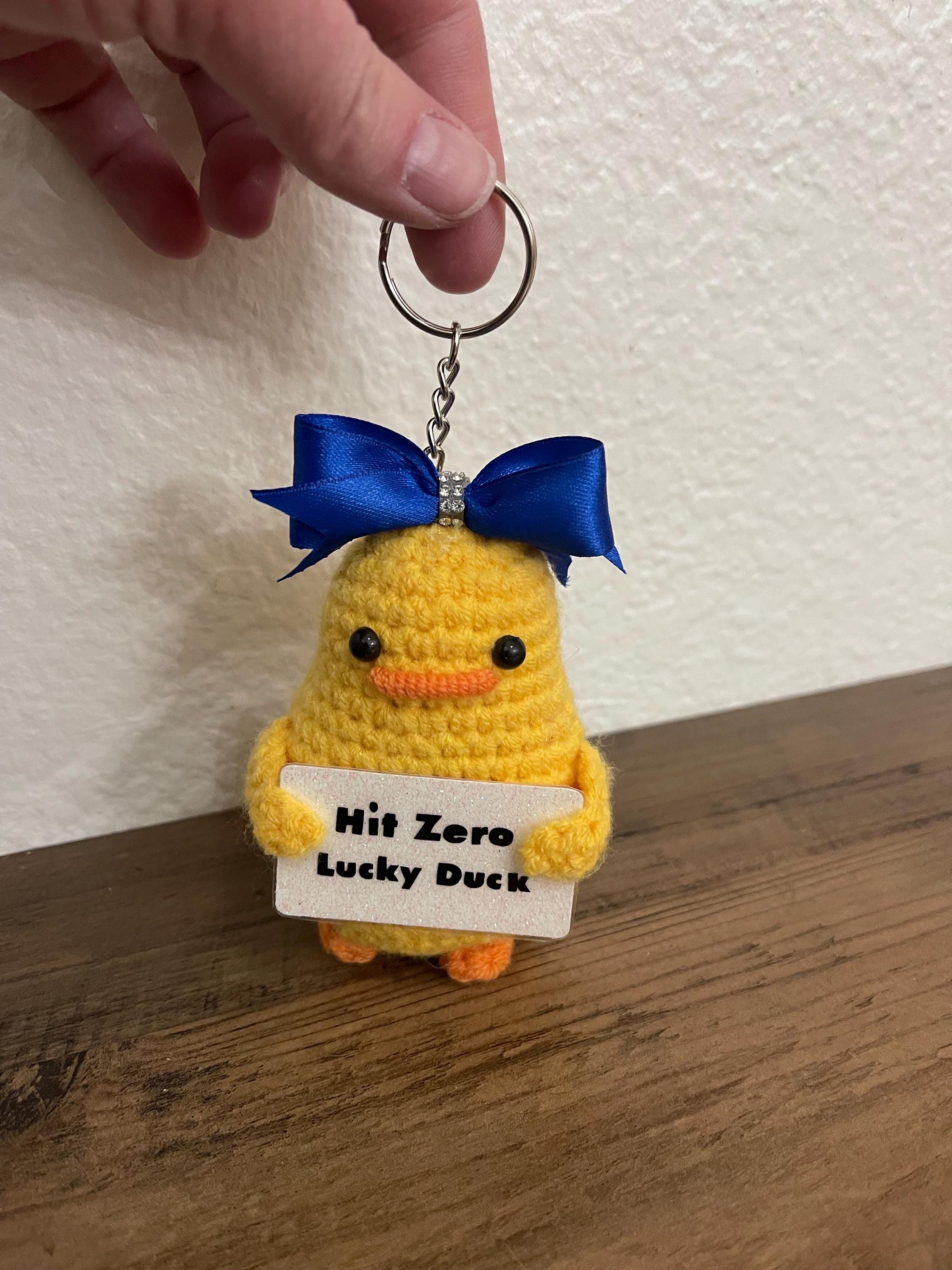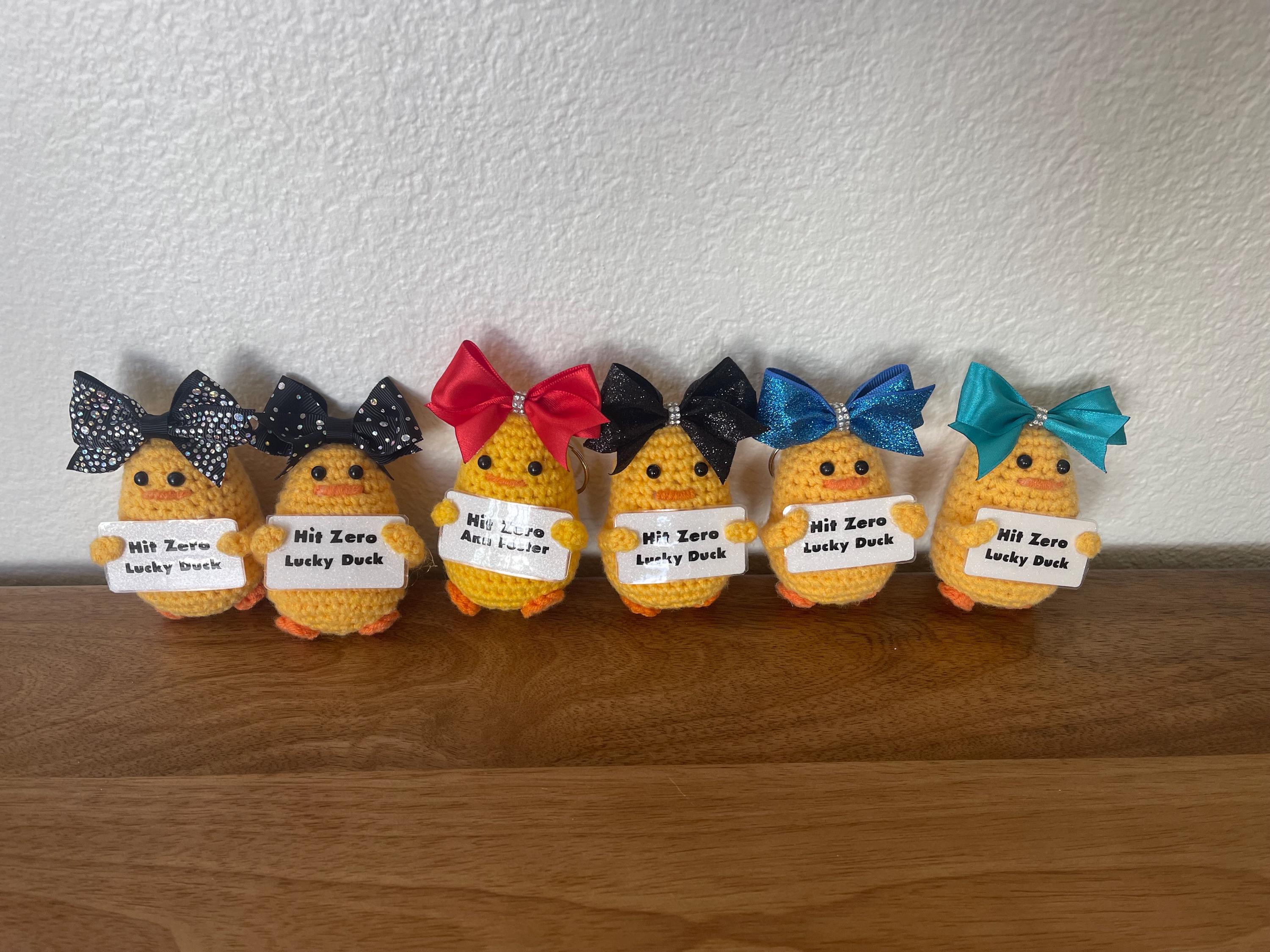 Yellow Crocheted Emotional Support Stuffed Positive Cheerleader Duck Keychain, Cheer Bag Tag. Custom Bow with Custom Positive Saying. Perfect for a Cheer Competition Gift or Team Gift!