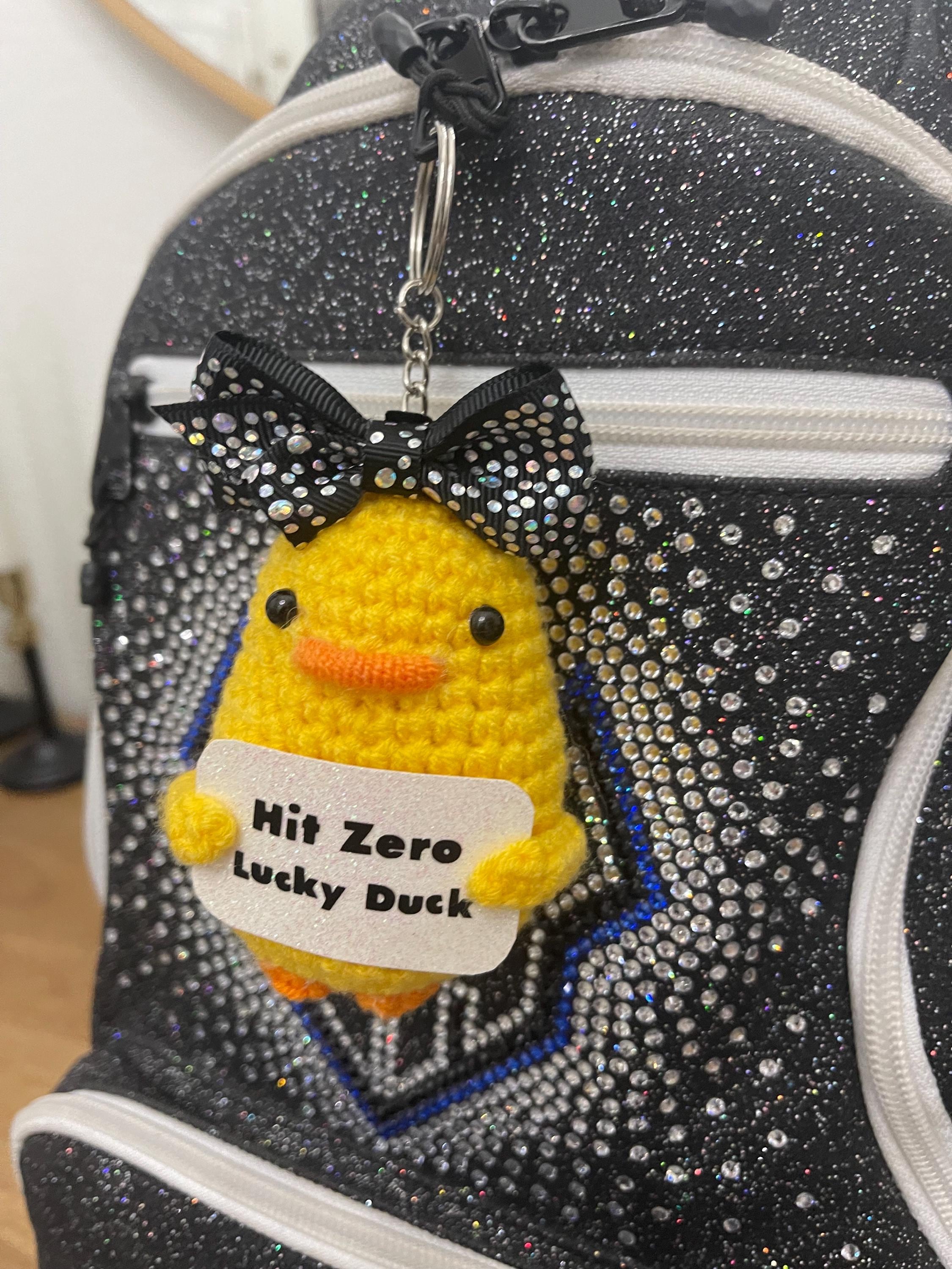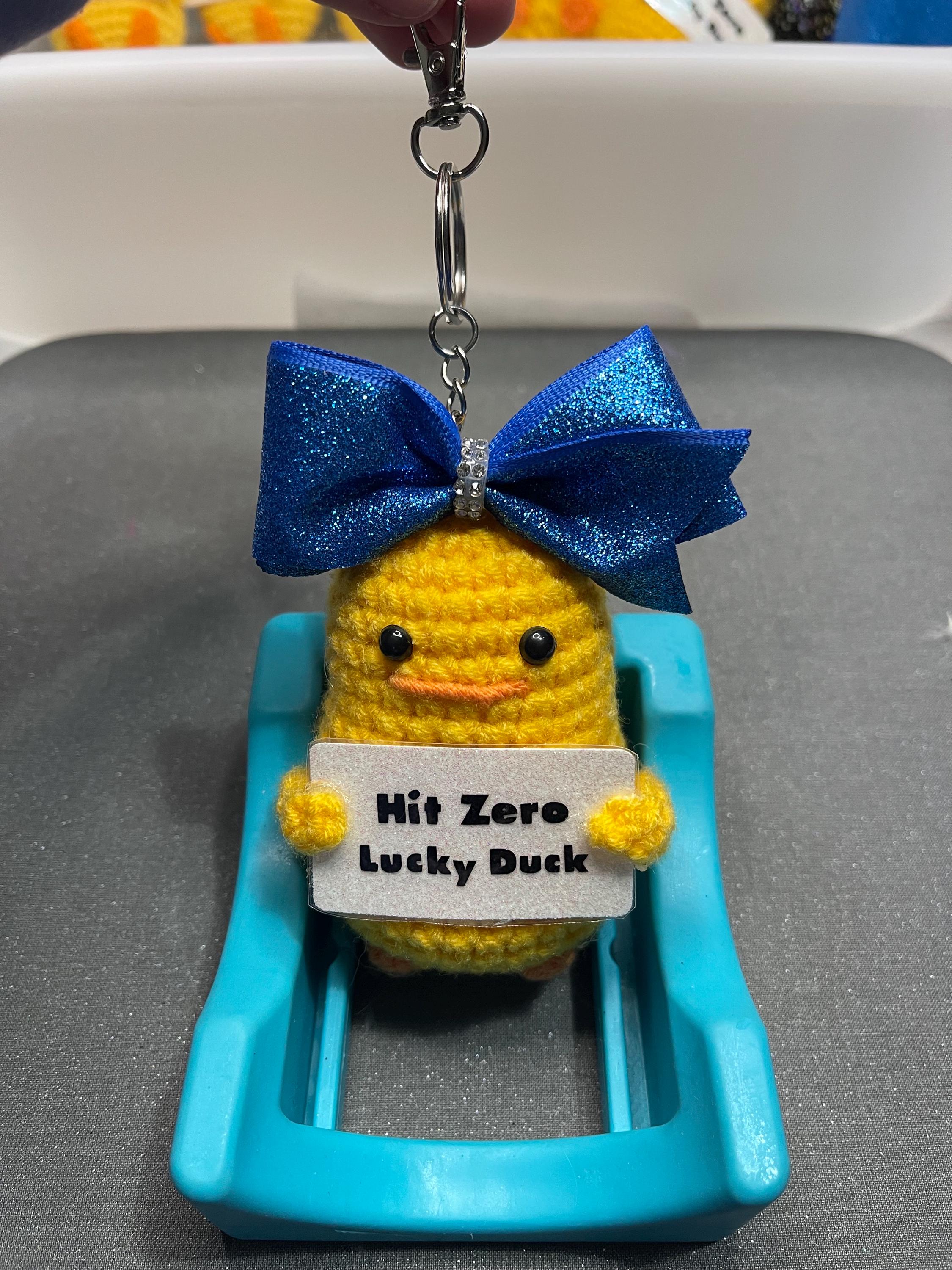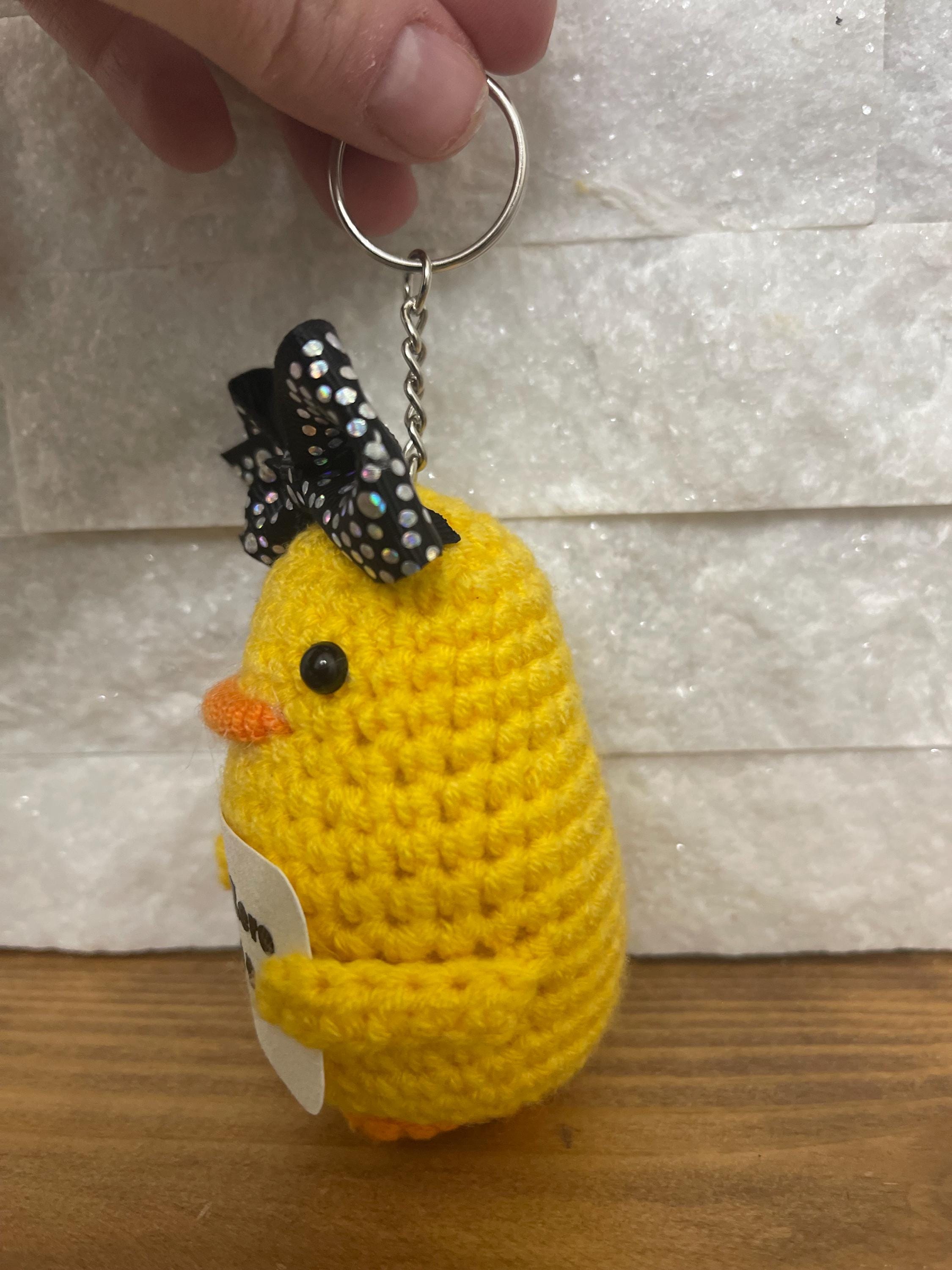 Yellow Crocheted Emotional Support Stuffed Positive Cheerleader Duck Keychain, Cheer Bag Tag. Custom Bow with Custom Positive Saying. Perfect for a Cheer Competition Gift or Team Gift!