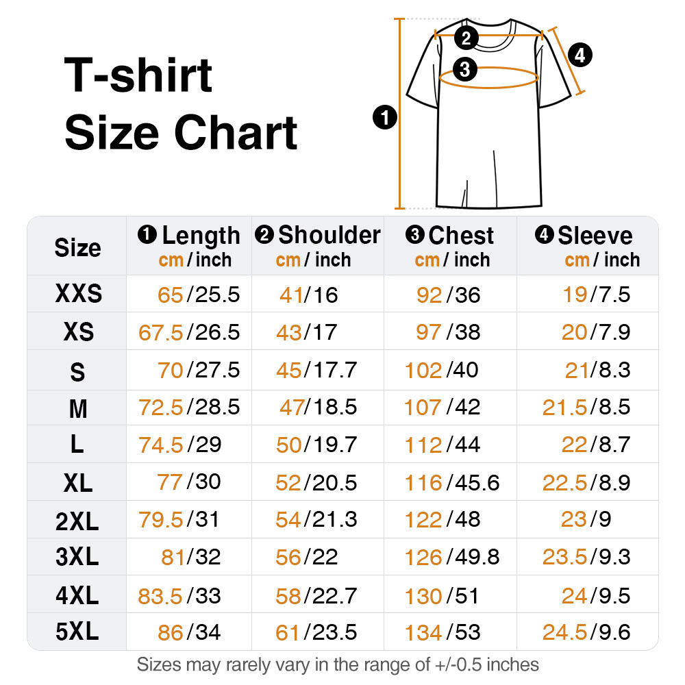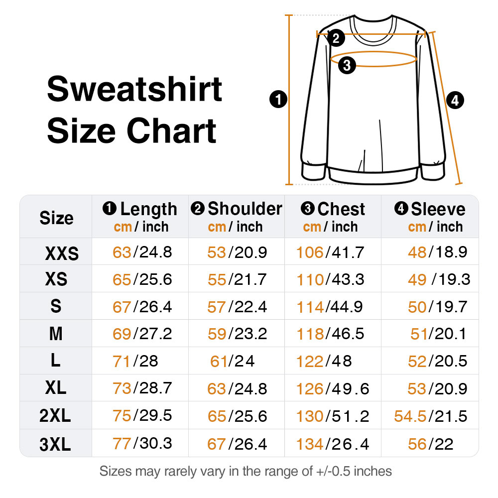 Measurements Adult T-shirt: XXS, XS, S, M, L, XL, 2XL, 3XL, 4XL, 5XL; Adult Sweatshirt: XXS, XS, S, M, L, XL, 2XL, 3XL; Kid T-shirt/Sweatshirt: 3-4Y, 5-6Y, 7-8Y, 9-10Y, 11-12Y, 13Y