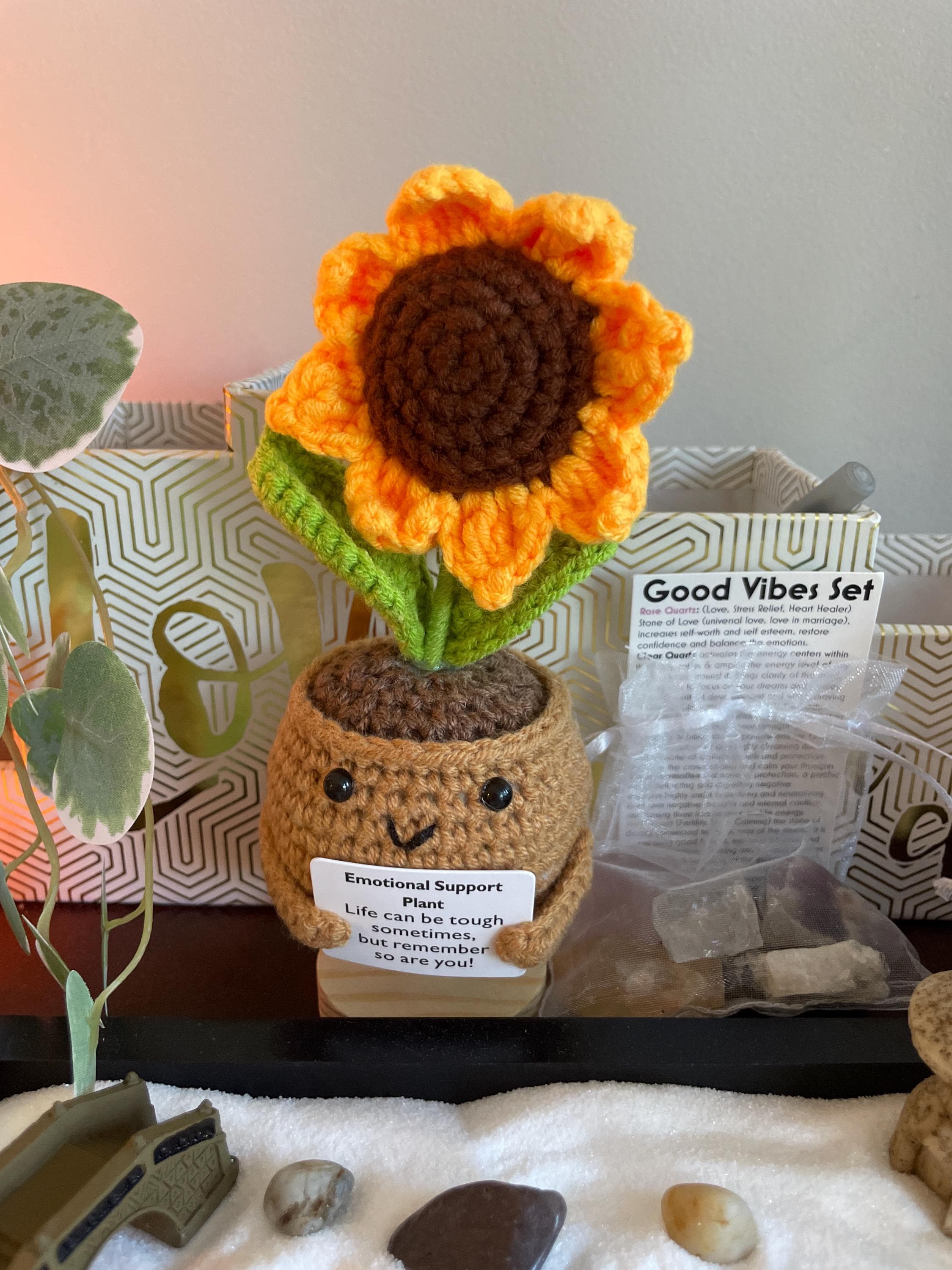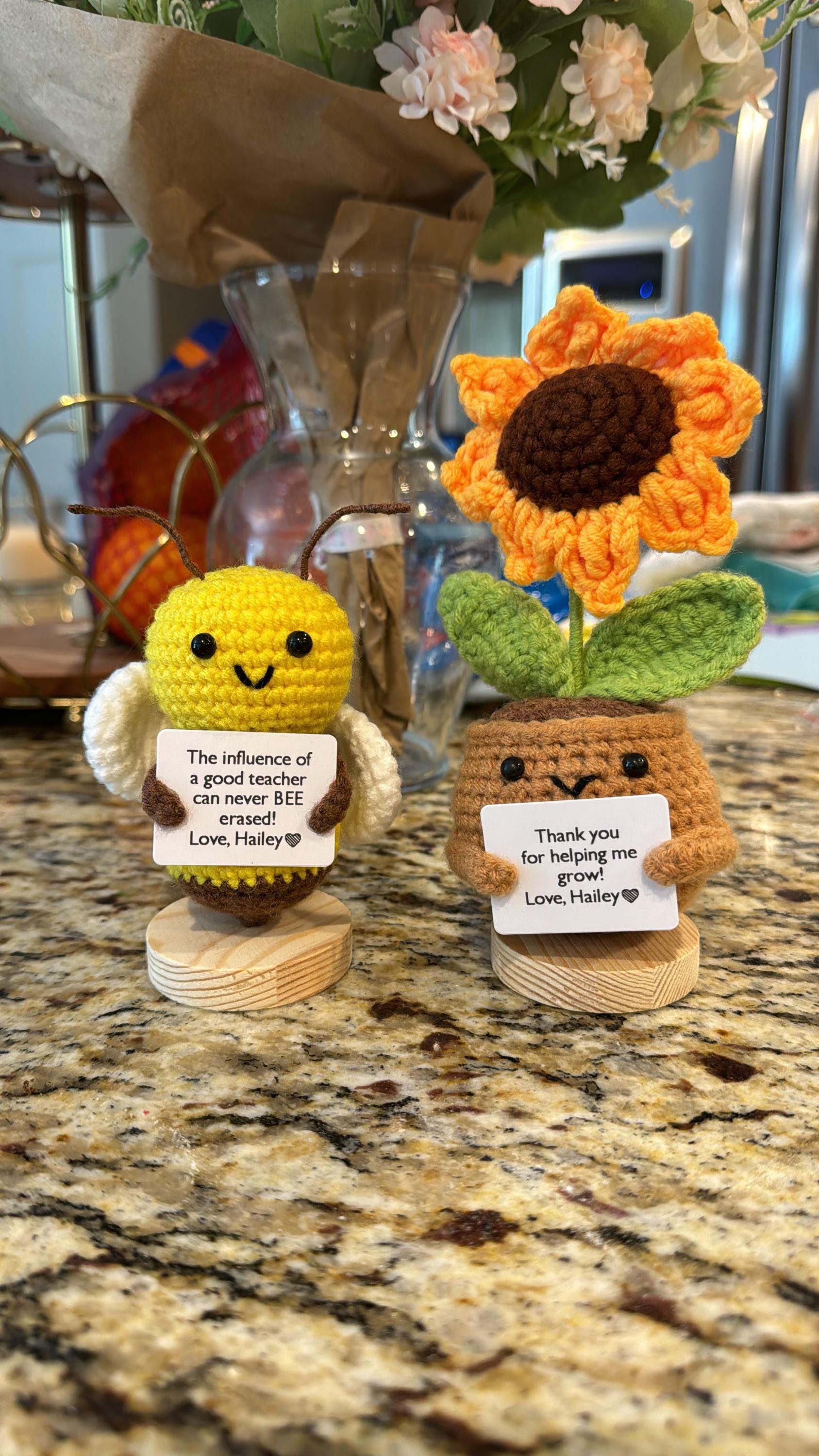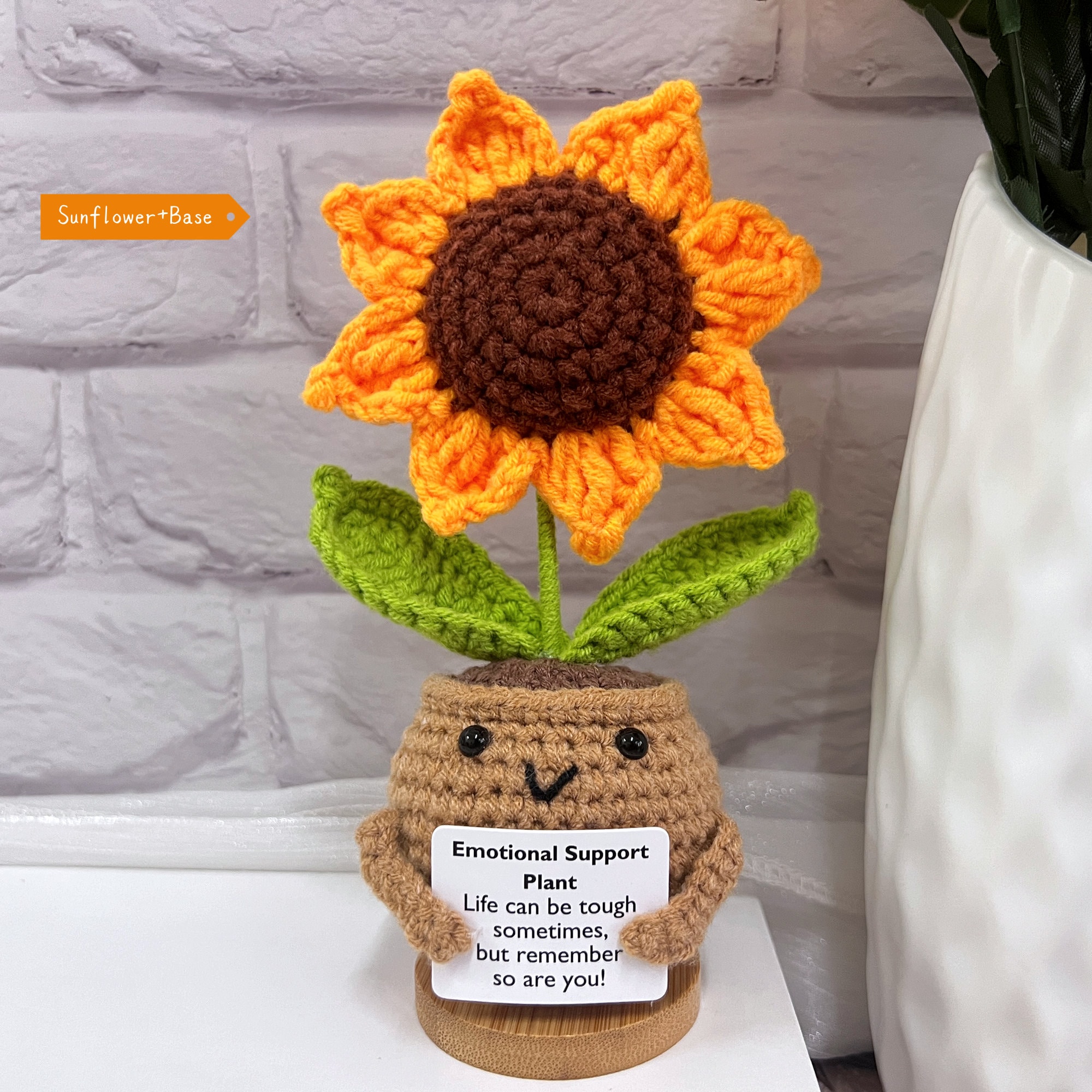 Presenting our charming handmade crochet sunflower potted plants and bees, carefully crafted to bring joy and emotional support to any environment. More than just decorations, these pieces embody heartfelt appreciation and encouragement.