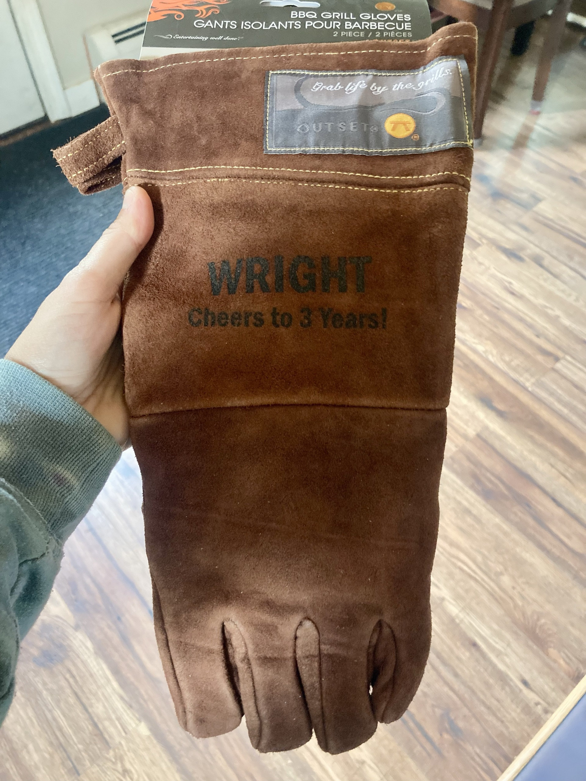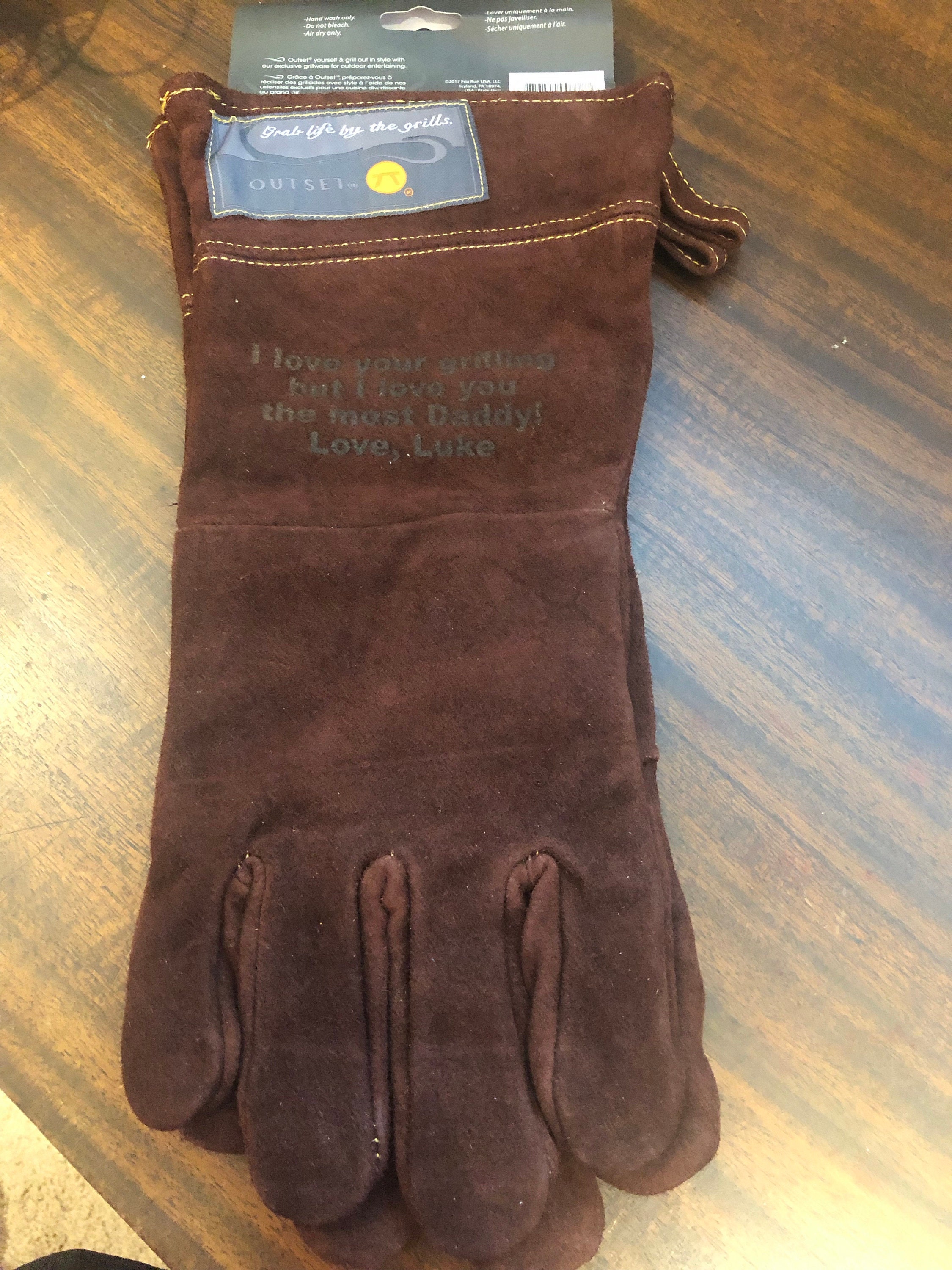 The personalized grilling gloves are great for both the BBQ and the kitchen. If you're looking for a unique grilling gift for men, this is the one he most like doesn't have in his BBQ drawer yet. Tour hands and wrists will be protected from the heat with this quality brown leather glove set. These gloves provide enhanced dexterity, making it easier to handle grilling tools while wearing.