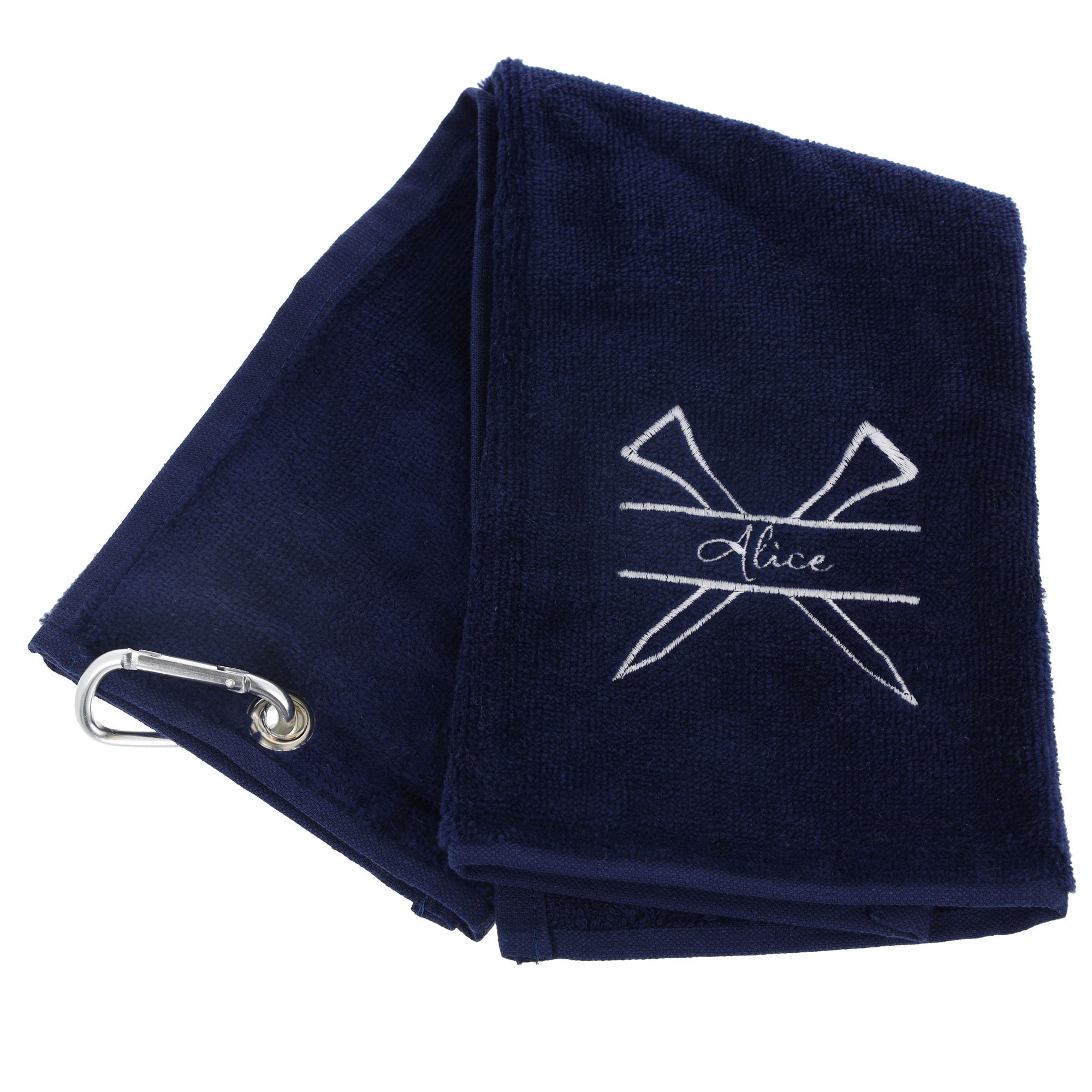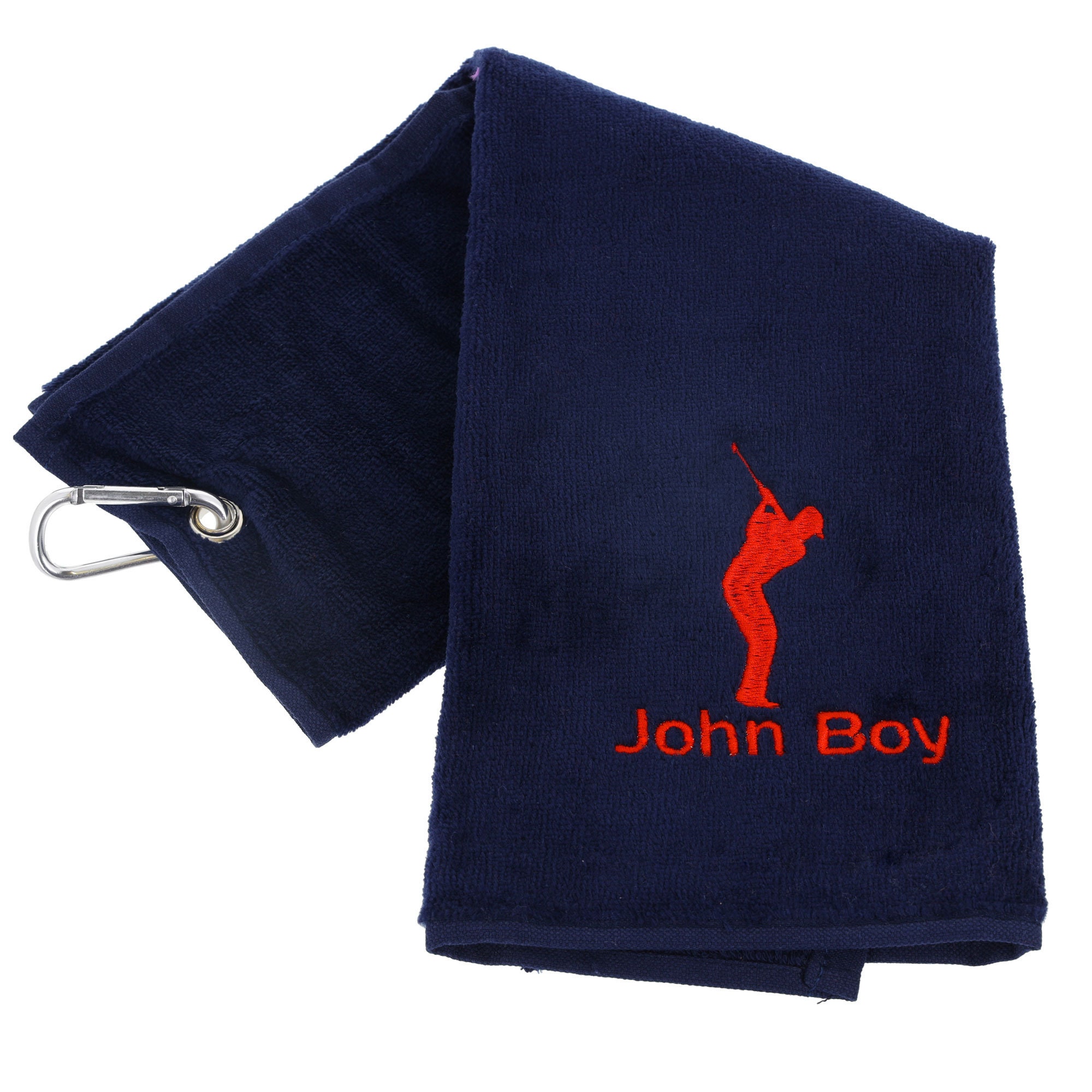 Personalised embroidered tri-fold golf towel with embroidered golfer, golf club, golf ball or crossed tees and customised with name or initials.