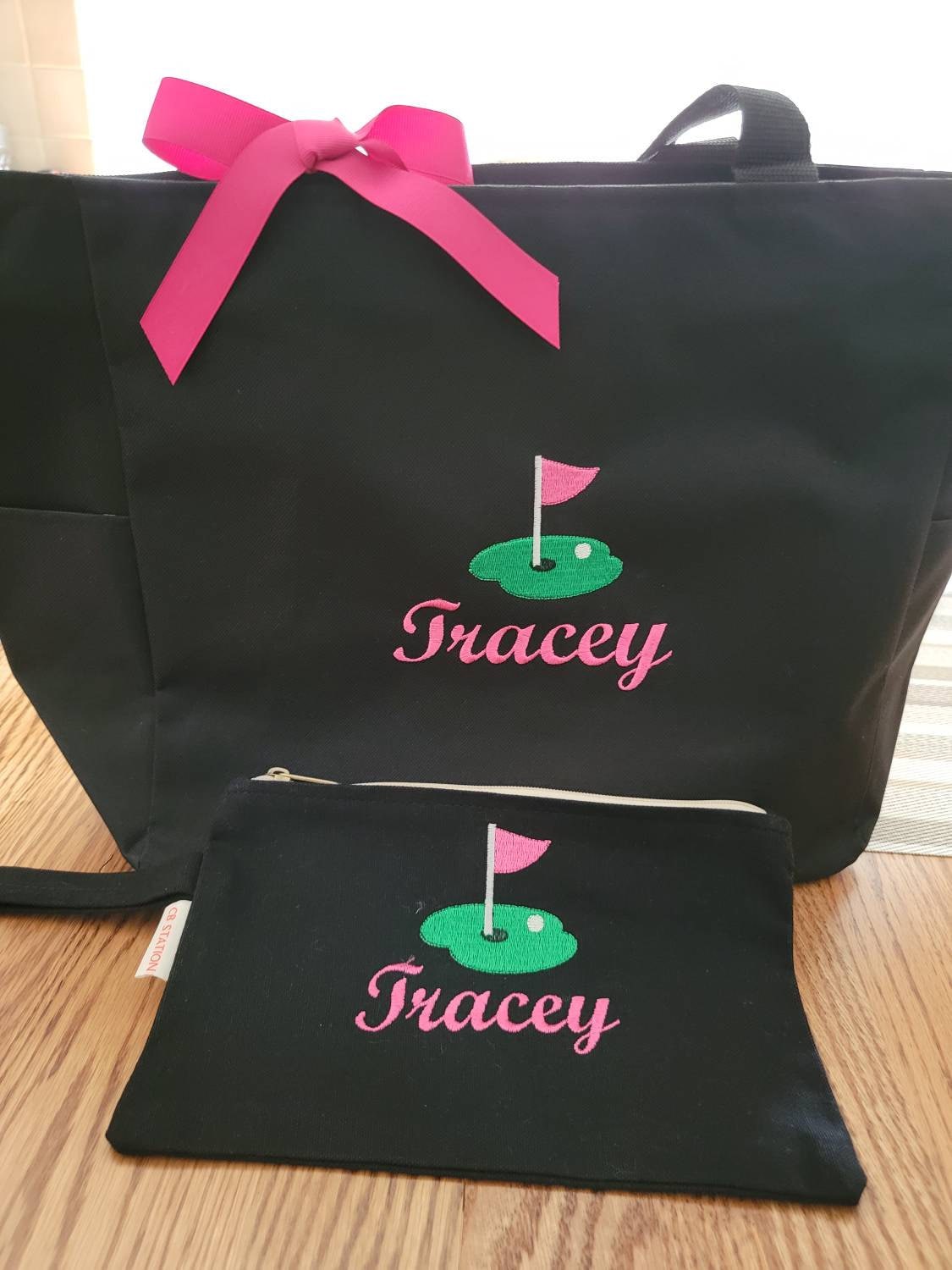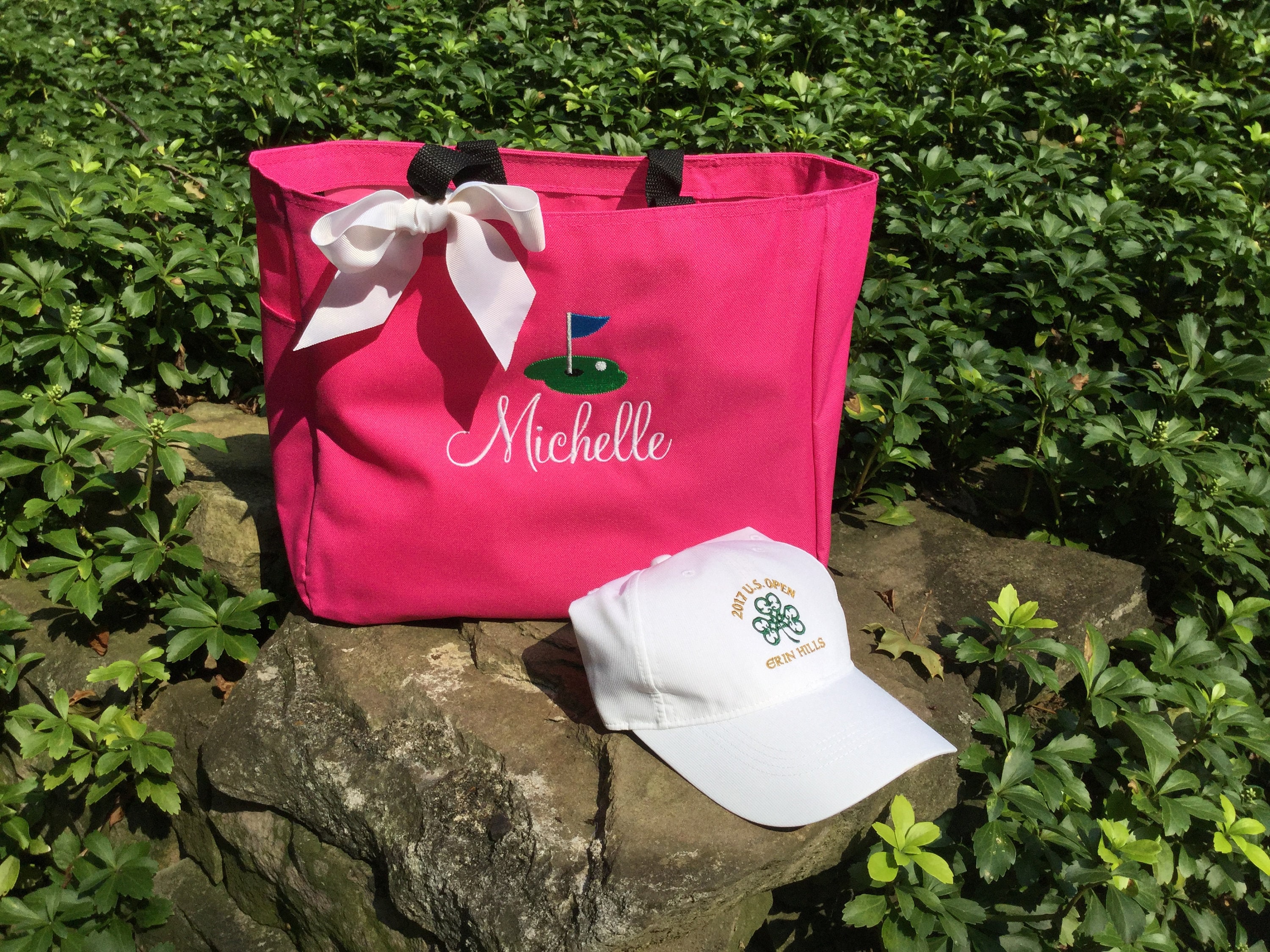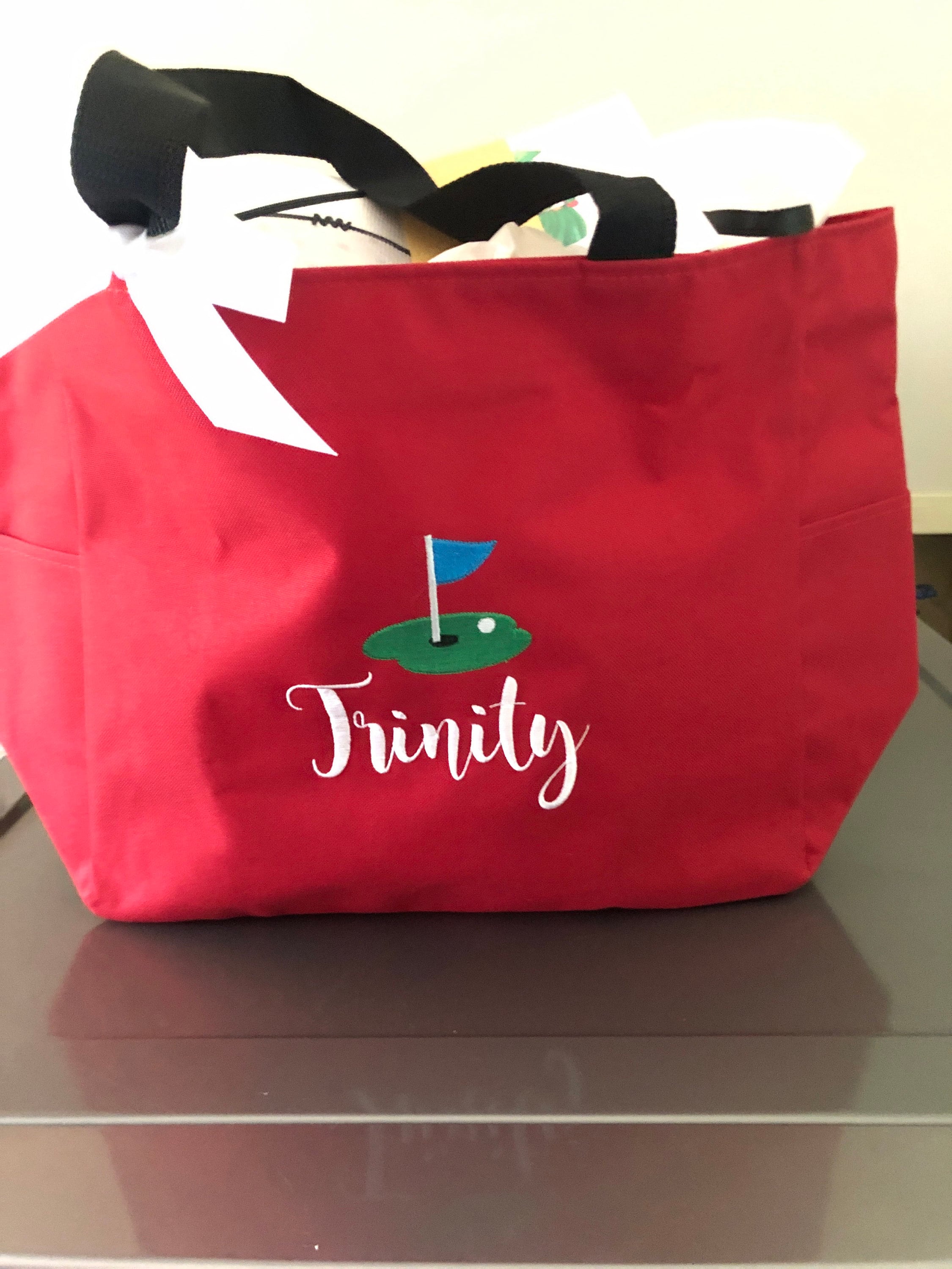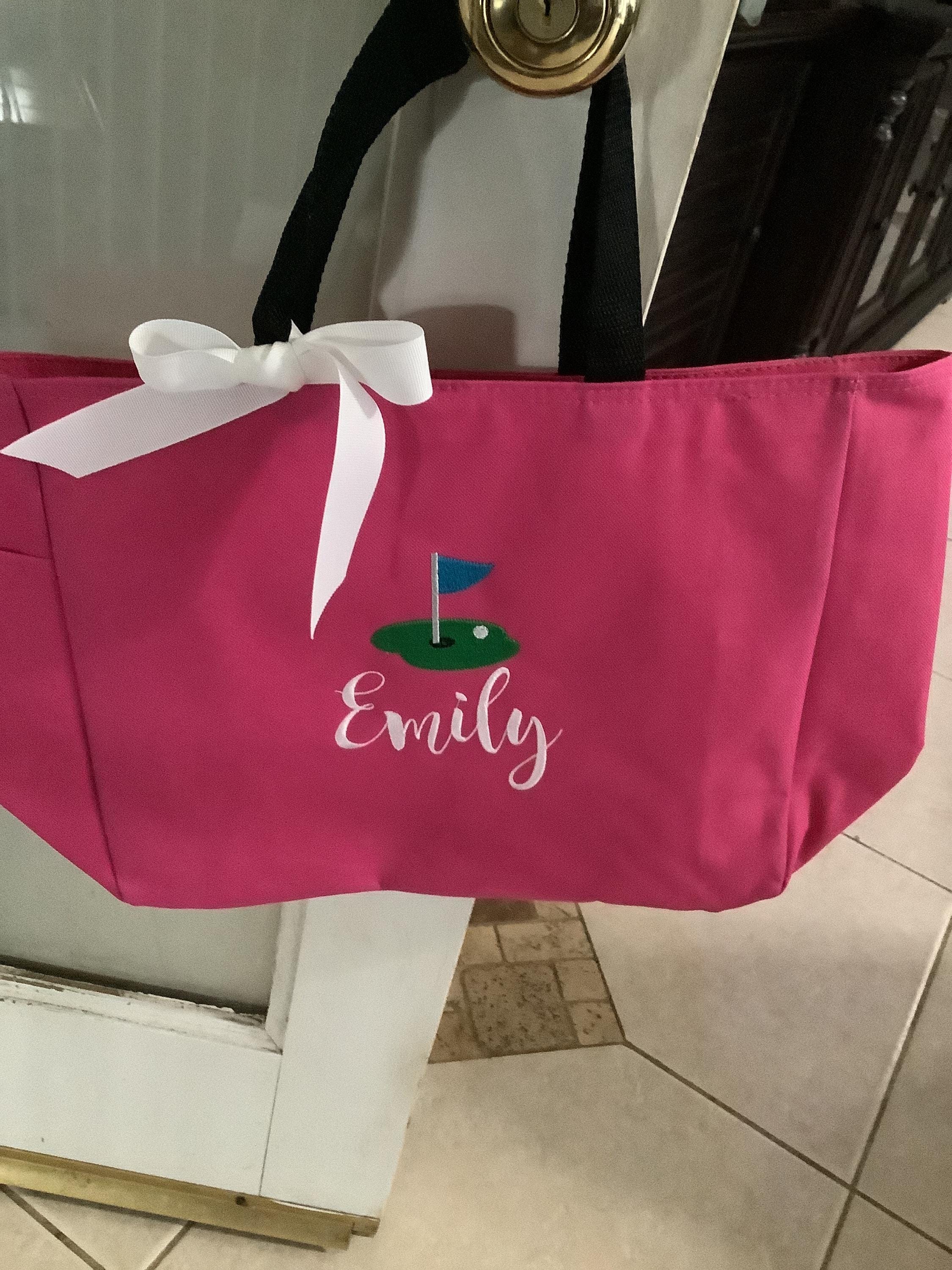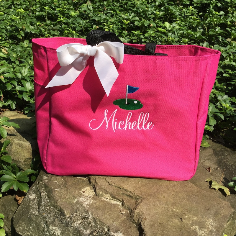 Functionality and Style. This large, sturdy tote combines functionality and style. Measures 12"H x 14"W. Versatile enough to carry golf accessories or post-round freshening essentials. Show off your love of golf and use the tote for work or to the market. Our embroidered golf green design is so fun. This bag instantly takes on style when you add the personalized design of your choice.
